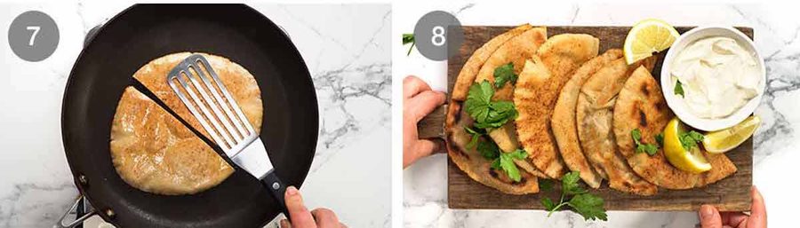 - Stuff – Gently open a pita then place the meat inside. Close, then press to spread to the edge and make it fairly evenly flat. (Is your pita tearing? See Note 5 for tip!)