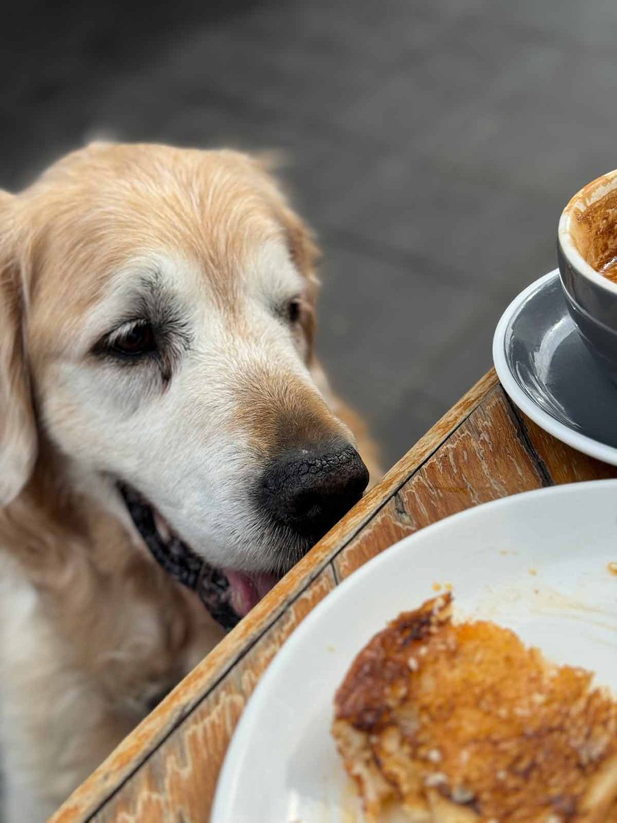 Dozer’s brunch strategy – patience and persistence. (Proven highly effective all his life!)
