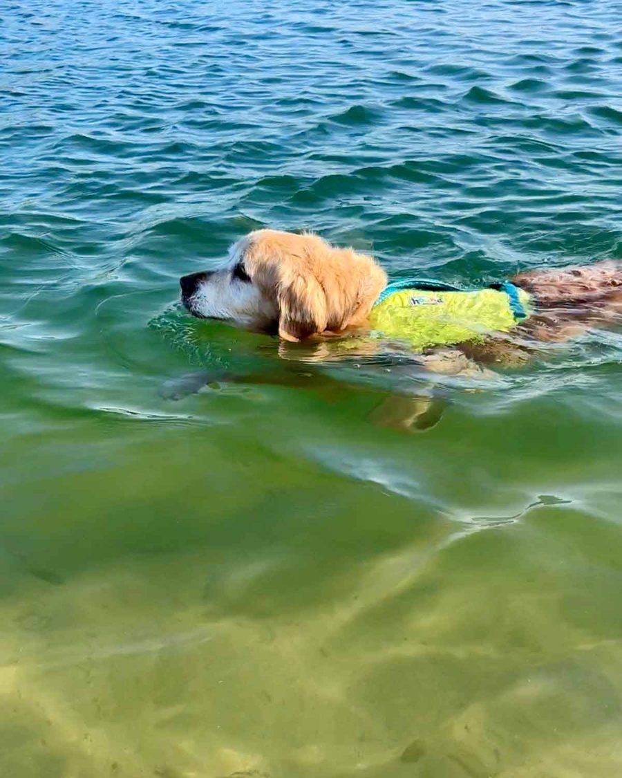 On a serious note: I originally got the High Performance Life Jacket several months ago when Dozer was still mid-rehabilitation, but ended up returning it because I didn’t think it provided enough buoyancy for him. But he’s come such a long away, even being praised by the Magic Dog Doctor for his progress (it’s like getting a gold star at school!), that I decided to give the High Performance Jacket a go again.