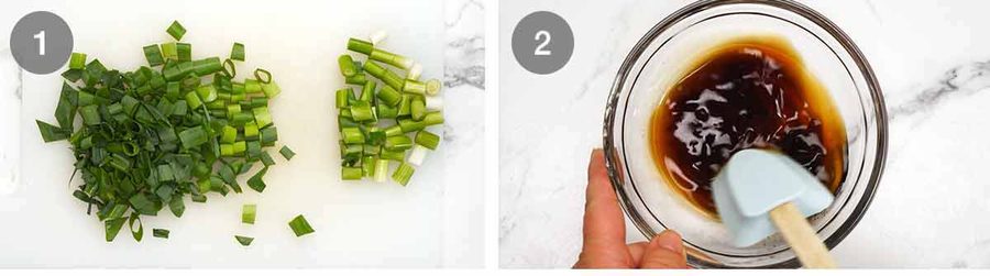 Green onion – Cut it into 1.5cm / 0.2″ lengths and separate the firmer white parts from the green parts. We add them into the pan at different times as the white part takes much longer to cook than the green part.