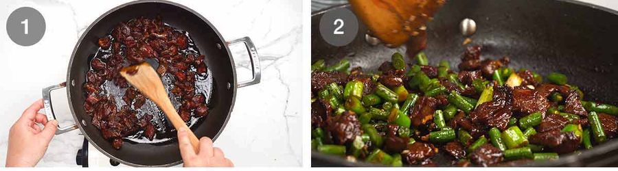 - Sizzle beef – Heat 2 tablespoons of oil in a large non-stick pan over high heat (mine is 30cm/12", see Note 8 for why no wok). Add the beef and cook for 2 minutes until the surface is sealed. Add the garlic, white part of the green onion and beans. Cook for another 1 minute until the beef is caramelised, stirring constantly so it doesn't catch and burn.
