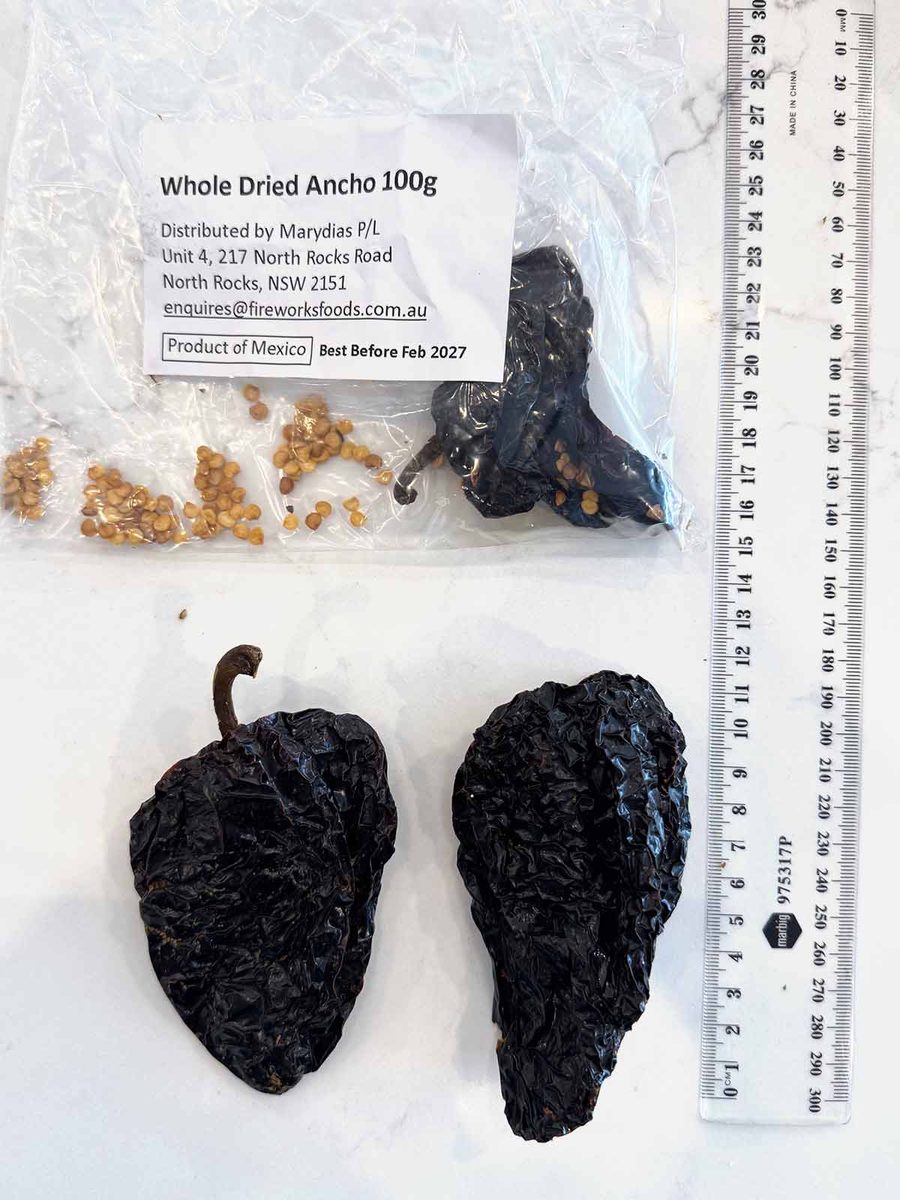 - 45 g (1.6 oz) ancho chillies, dried (~2-3 pieces, 1 cup once chopped) (Note 1)