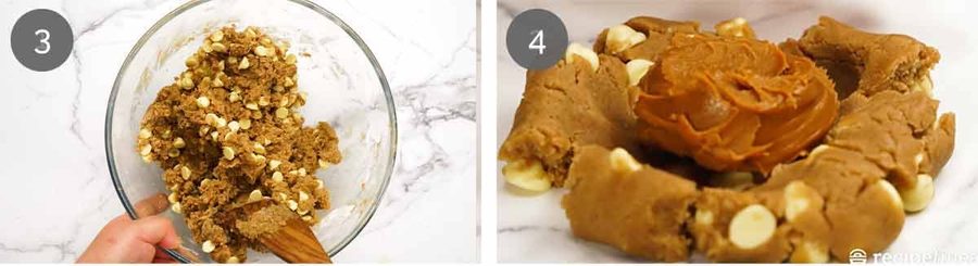 More flour – I added 1/4 cup more flour to make slightly stiffer dough. This is because the Biscoff spread inside becomes runny when it melts so the cookie spread too much. Adding flour gave the cookie dough more structure to hold it in. I was concerned the extra flour would make the cookie too dry but it doesn’t as it is offset by the extra moisture the Biscoff brings.