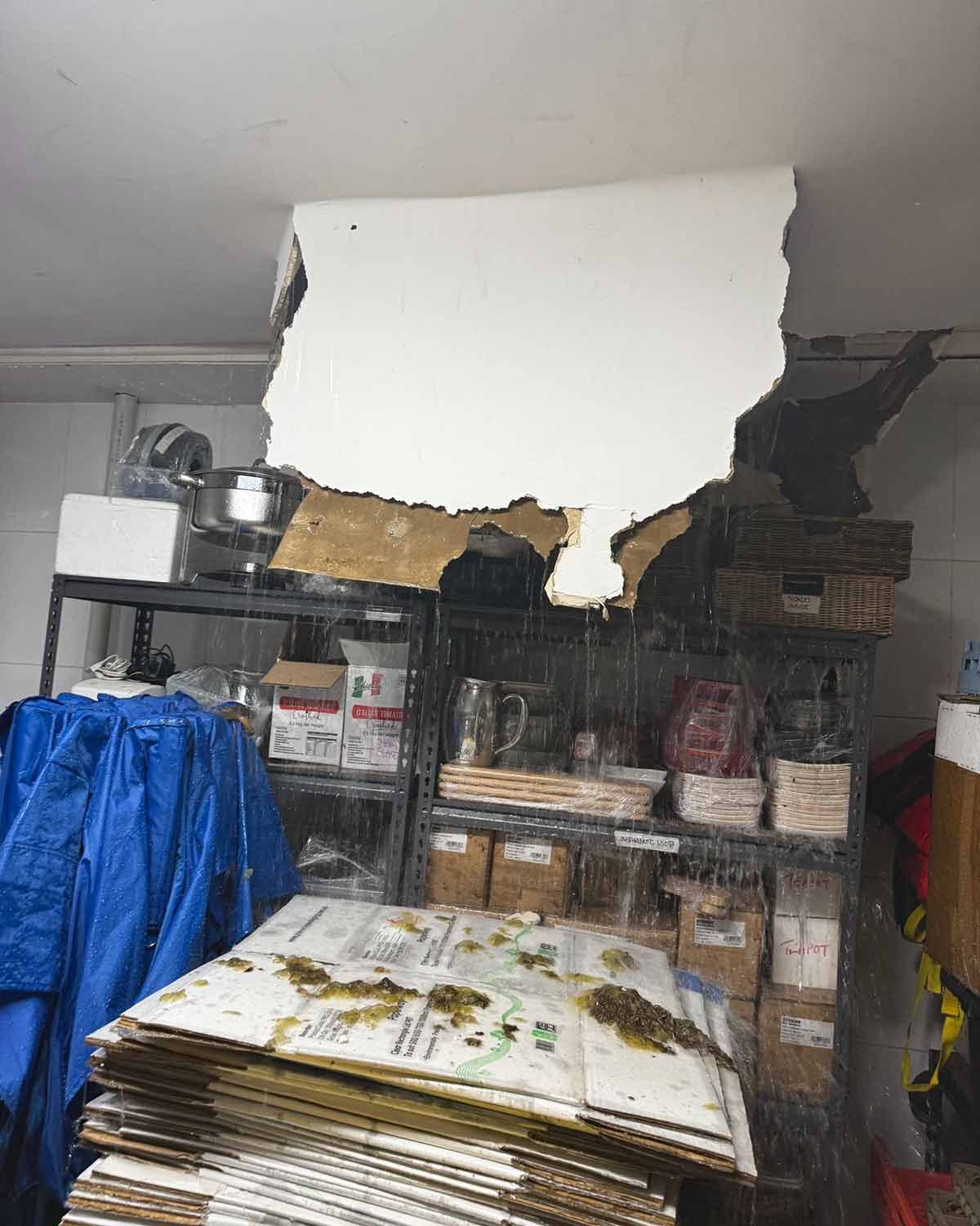 We had a ceiling collapse and water pouring into the kitchen about 6 weeks ago during sudden torrential rains. It happened in the middle of the day when the team was right in the middle of the cook.