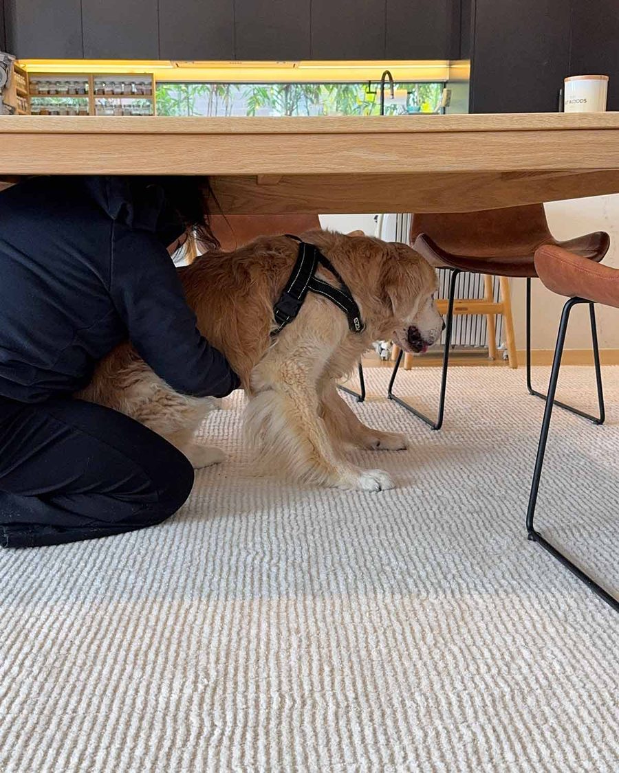 Does it surprise anyone that his favourite place is under the dining table so I have to crawl under there to help haul him up, bonking my head repeatedly?