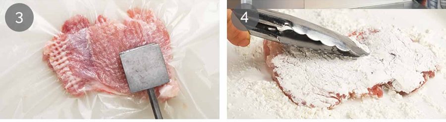 Pound chicken with a meat mallet, skillet or saucepan until it is 0.7cm / 1/3″ thick. Cover with a freezer bag or Go-Between to protect the meat so it doesn’t tear. (Go-between is like cling wrap but it’s thicker and doesn’t stick to itself. Sold alongside cling wrap at the grocery store, it’s useful for keeping stacked food in the freezer from sticking to each other, and protecting meat from being damaged when pounding).
