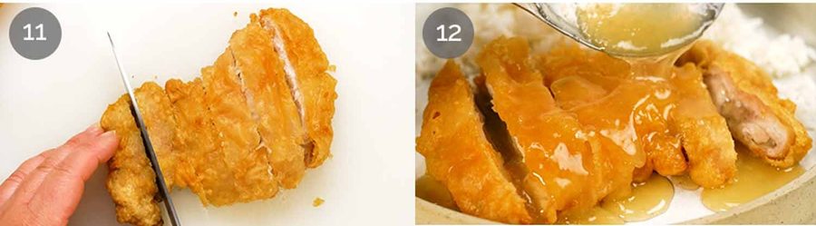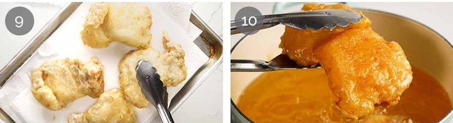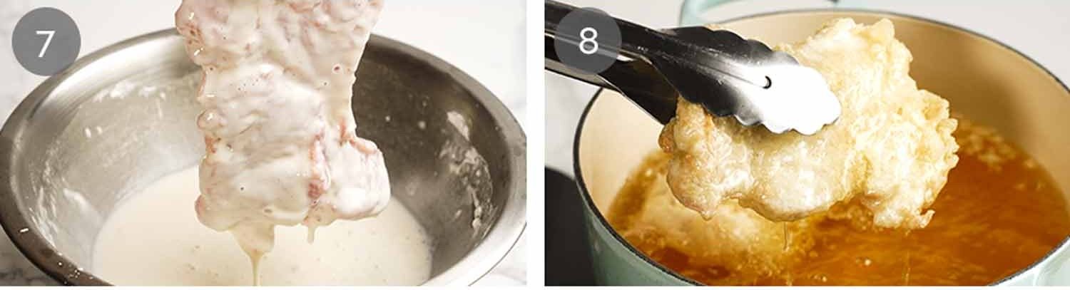- Pound chicken to 0.7cm / 1/3", salt, dust with cornflour. Dip in batter, fry 3 min at 160°C/320°F, cool 20 min, fry again 3 min at 200°C/390°F until dark golden and crispy. Slice, serve with sauce (simmer 3 min).