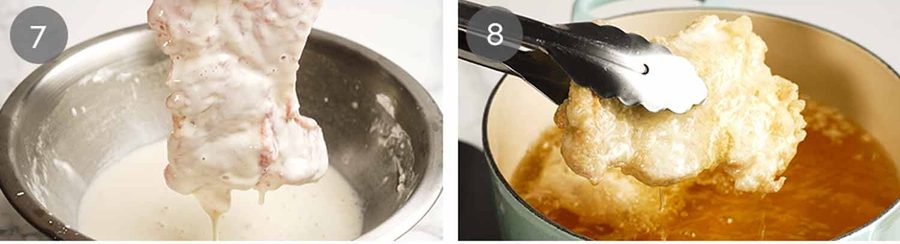 Coat – Dip the chicken in the batter and hold it up for a couple of seconds to let the excess dip off. The batter should be thick enough to fully cover the chicken but can be ever so slightly translucent.