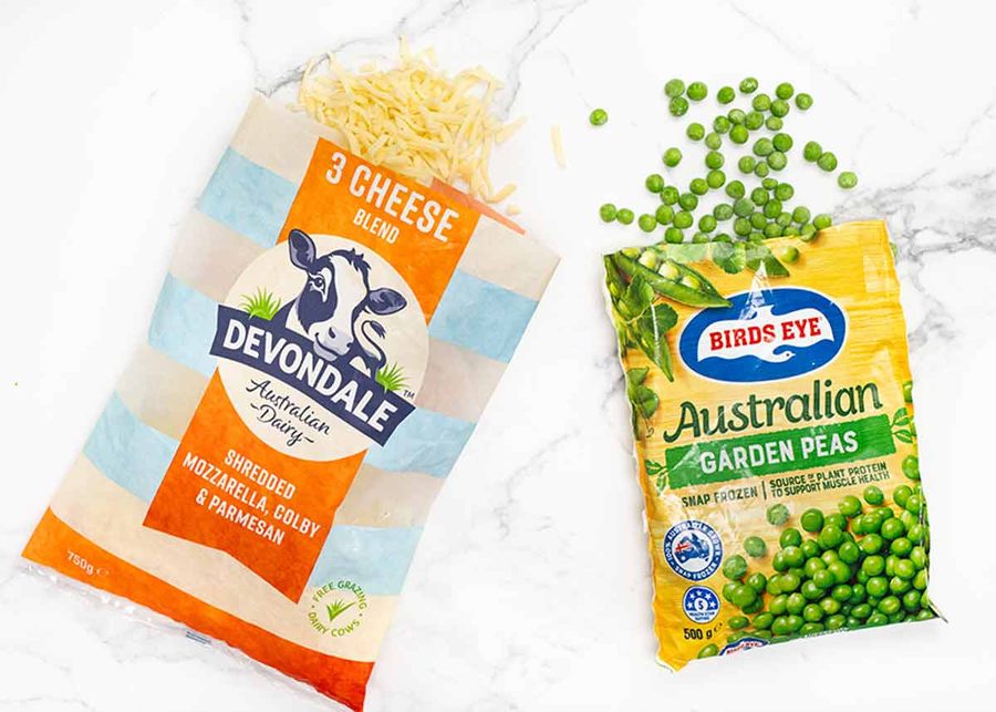 Frozen peas – Just regular frozen peas or baby peas, it works fine for both. No need to thaw or pre-cook. Frozen peas are cooked before being frozen so there’s no need to cook it beforehand, they just need to be heated which happens in the time the fritter takes to cook on the stove (3 – 4 minutes).