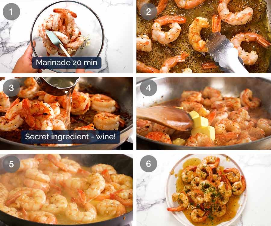 Just 6 ingredients – prawns, garlic, white wine, butter, olive oil and lemon (I get salt and pepper for free). Prawns are delicious plain, so simple is best!