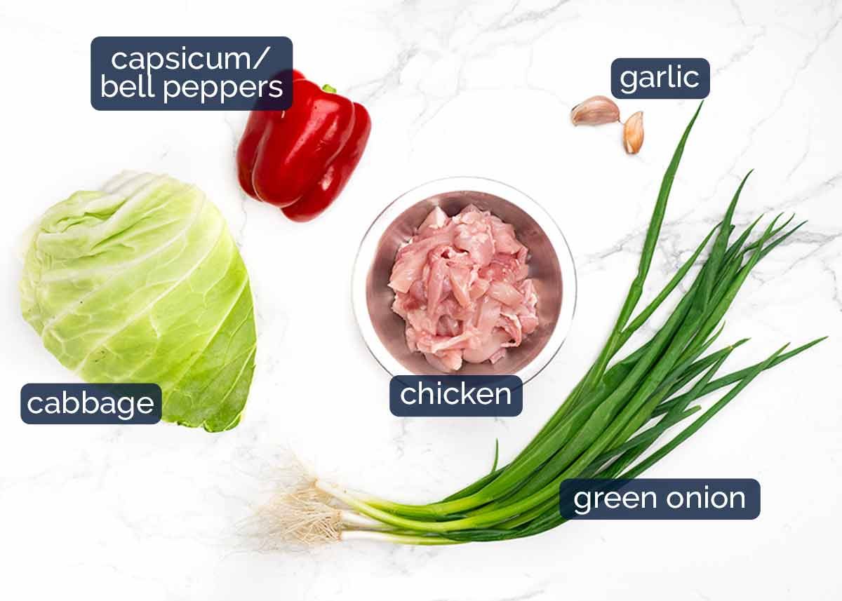 - Marinate chicken with 1 1/2 tbsp Sauce. Cook chicken 1 min, add garlic and white part of green onion, cook 1 min. Add capsicum & cabbage, cook 2 min. Add green part of green onion, noodles, sauce, toss 2 min. Serve!