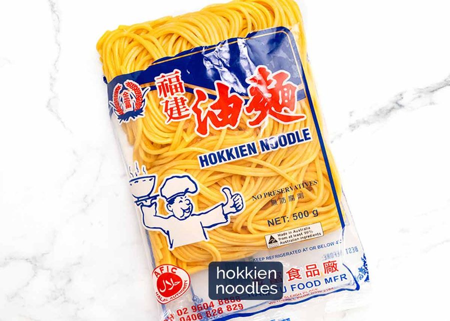Hokkien noodles are medium thickness yellow noodles made from wheat. Get them from the fridge if you can, rather than vac-packed varieties from the aisle. Better texture, better flavour, and less tendency to break easily when tossed in the pan.
