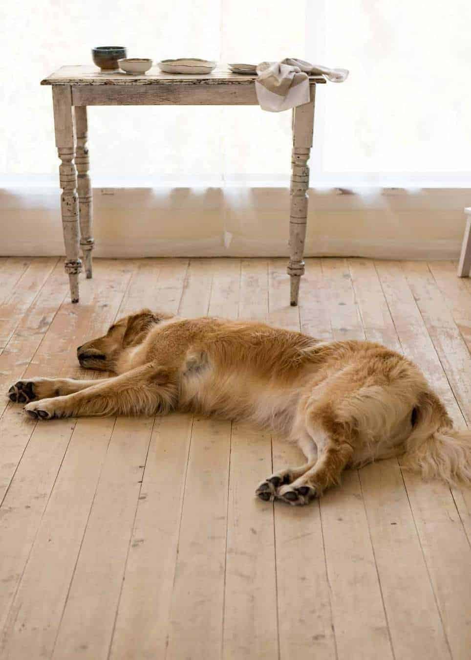 He just sprawls across the floor when he sleeps. No curling up cutely, chin on paw, like all those cute doggy pics you see all over the internet. Nope, this one just collapses and sprawls out right in my line of path (straight line from kitchen to table is over him – of course).