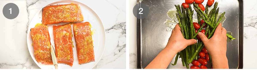 I’m using asparagus and cherry tomatoes because they cook in the same time as the salmon. Try to use thicker asparagus, else it will get a little too soft. If you can only find thin ones, consider adding them onto the tray partway through the cook time.