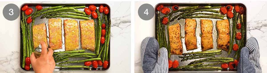 - Prepare tray – Toss the asparagus and cherry tomatoes with the olive oil, salt and pepper. Spread out on a large tray then clear space for the salmon. Place salmon on the tray leaving a bit of space between each. Spray surface of salmon with oil.