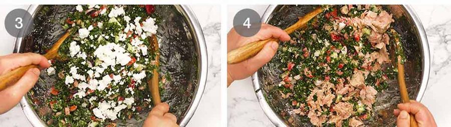 Think: a loaded tabbouleh. Except with tuna, a creamy feta dressing, added bulk and nutritional goodness from kale, plus olives, capsicum and red radish.