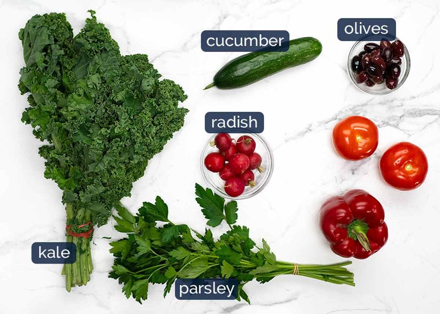 Toss in stages – Put the kale, capsicum, tomato (scrape in all the juices too), cucumber, radish and olives. Pour over all the dressing and toss well. Crumble in the feta and toss again – it will smear which is a good thing!