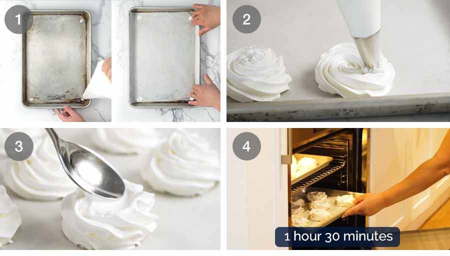 Cool in oven 4 hrs to overnight – Turn the oven off then leave the pavs in the oven for 4 hours or even overnight (this is what I usually do). During this step the surface of the pavs will dry up and crisp up, while the middle will stay nice and marshmallowy.