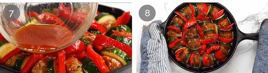 - Toss Vegetables, mix Sauce. Make meatball mixture, roll and squish 16 meatballs, wedge between zucchini rounds, tuck capsicum in. Pour over sauce, bake 35 minutes at 200°C/375°F (180°C fan).