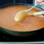 - Add the milk and whisk for 1 minute, in small circles around the fry pan, until it starts to thicken. Then add the tomato passata, water, salt and pepper. Increase the heat to medium high and cook for around 5 minutes or until thick enough to coat the back of a metal spoon (see photo below). Whisk occasionally for the first 3 minutes, then whisk constantly for the last 2 minutes.