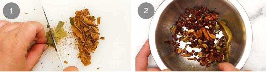 - Chop hard spices – Roughly cut the cinnamon, bayleaf and star anise into ~1cm / 0.4" pieces.