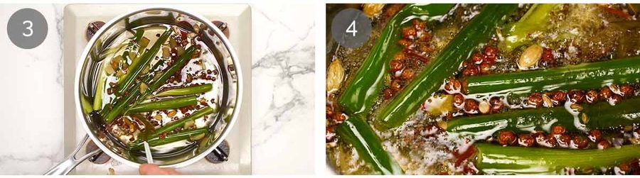 - Oil infusion – Put the soaked spices into a 20cm/8" saucepan with the green onion, ginger and cold oil. Start on medium-low, then adjust the heat until you see small fizzy bubbles coming up from the base.