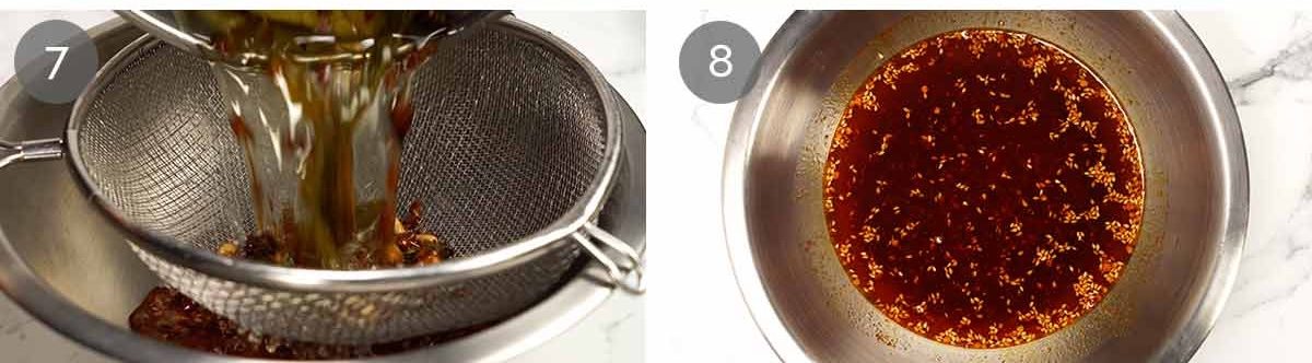 - Strain – When the infused oil is done, strain the hot oil into the bowl using a fine-mesh metal sieve. Then mix. Discard all the used spices etc caught in the strainer. (Note 8 on oil temp)