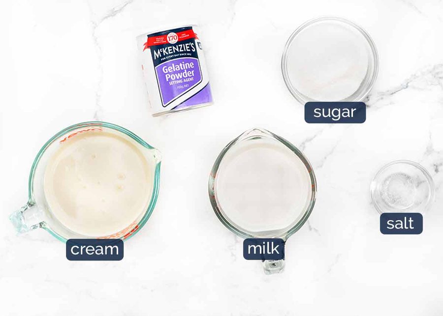 - Bloom gelatine in saucepan 5 min, warm to melt. Add sugar, milk, vanilla and salt, once milk is warm, cool 10 min. Add cream, fridge 1 hr (stir), then pour into lightly oiled moulds. Fridge 6 hrs+, invert!