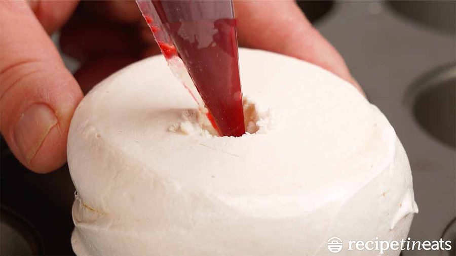 - Access hole! Place a pavlova bomb upside down in a muffin tin, to hold in place as you work. Carefully cut a 1cm / 0.4" hole in the middle using a small sharp knife. Stick a chopstick into the hole and squidge around GENTLY to move some pavlova marshmallow centre out of the way to make room for the fillings.