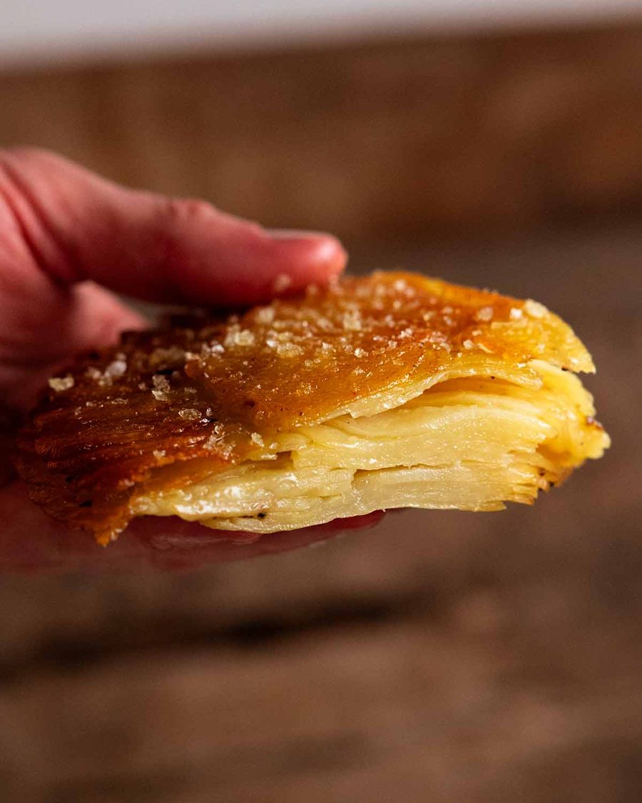 - Build 3 layers of thinly sliced potatoes (1.5mm / 0.06") in a spiral pattern brushing with clarified butter and seasoning as you go. Bake 70 minutes at 200°C / 400°F (180°C fan) covered with cartouche then 30 minutes uncovered. Rest 10 minutes, flip, and enjoy!