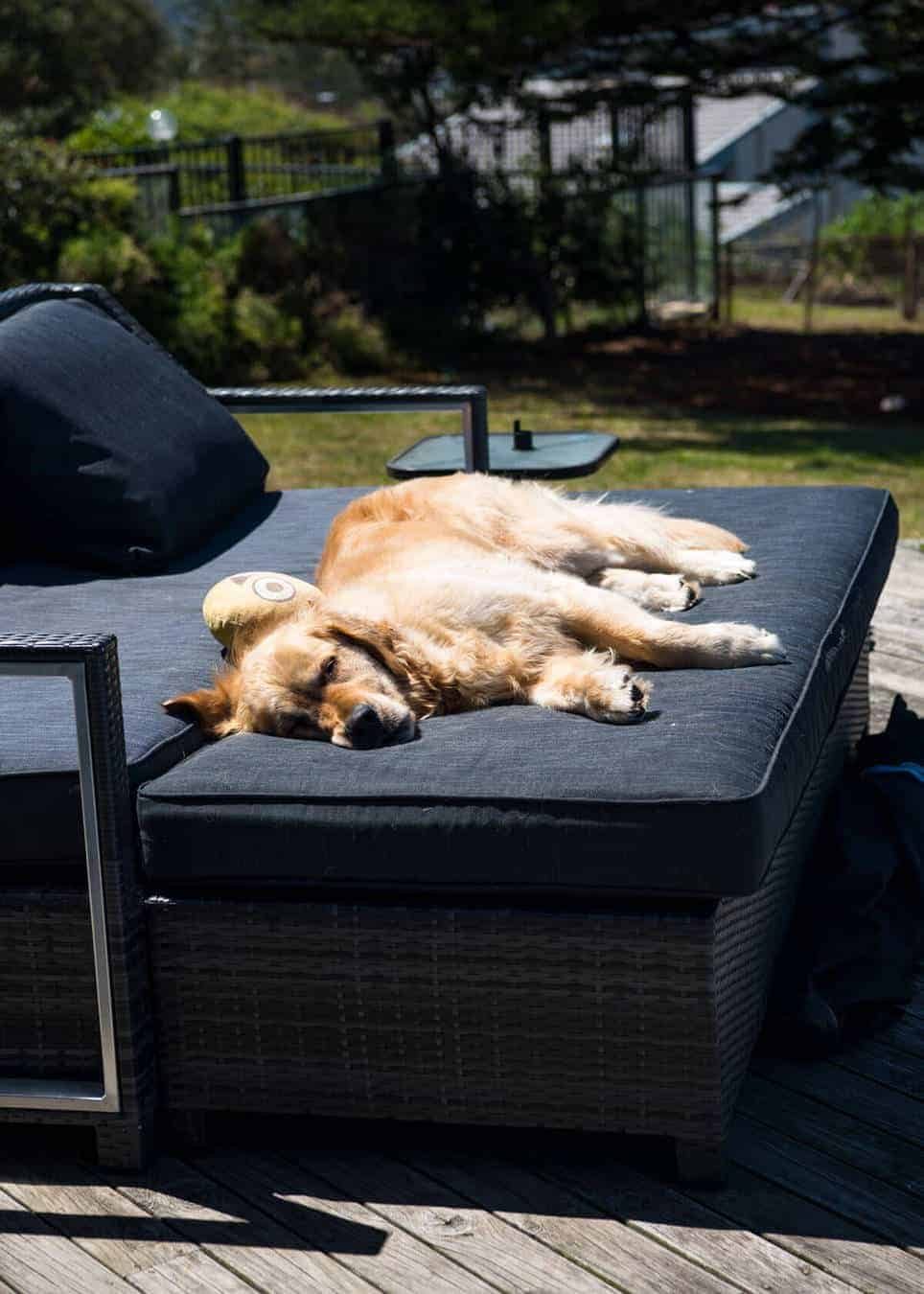 Oh wait. He may just be sun baking. Or exhausted after a dog park play. Who can tell? He spends a lot of time on this day bed.