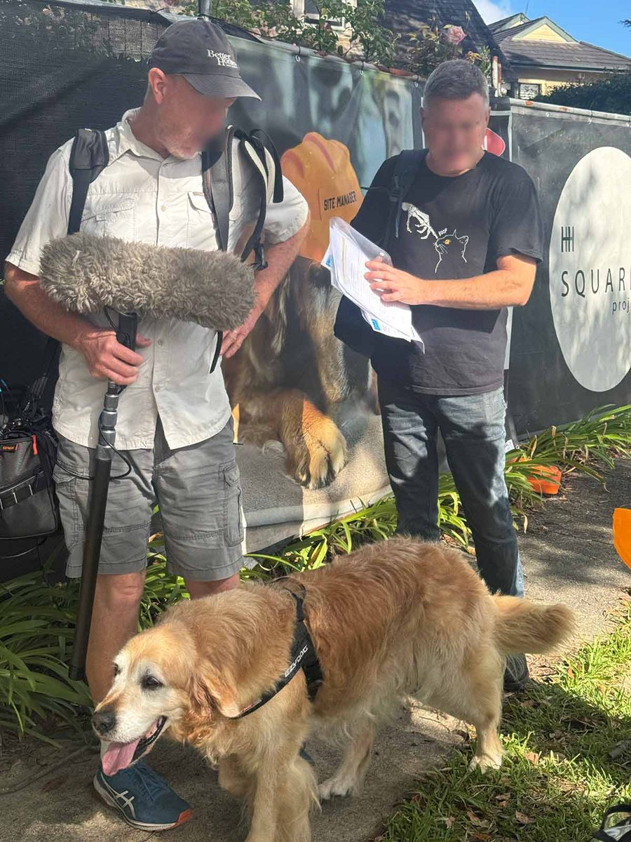 It even got to the point where he was ruining takes – just look at JB’s face in the photo below as Dozer howls mid-filming. So, we had to assign someone the very important (full-time) job of being the official Dozer silencer. That lucky person was Candice, my publicist from Pan Macmillan (my publisher). Poor thing had to endure smelly old-man Dozer breath huffed and barked in her face all afternoon! 😂