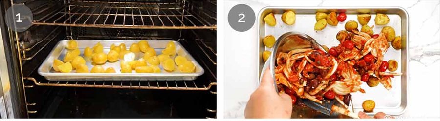 Potatoes first – Toss the potatoes with oil, salt and pepper. Then pop in the oven to give them a 20 minute head start.