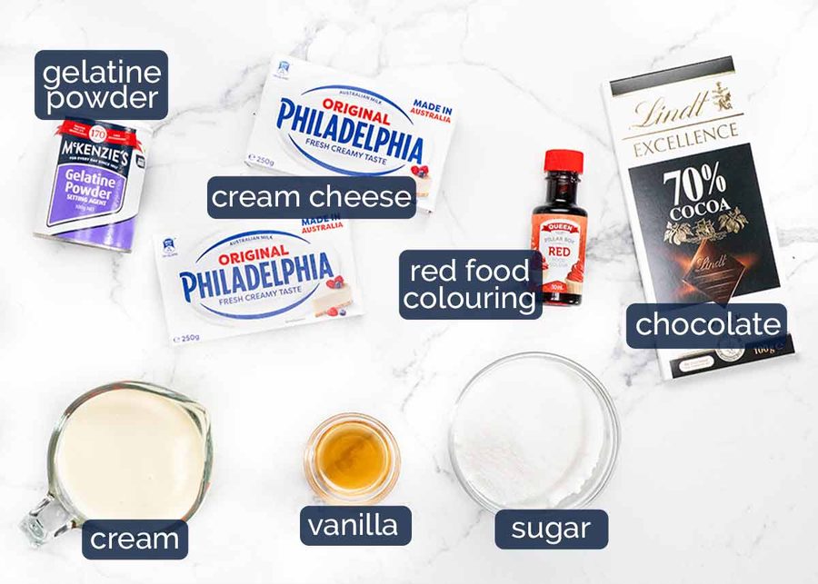 Cream cheese – I use Philadelphia, but if you’ve had success with other brands, feel free to use them. Note: use blocks, not tubs. Tubs are too soft as they are intended to be spreadable. If using tubs, increase gelatine slightly (see recipe notes).