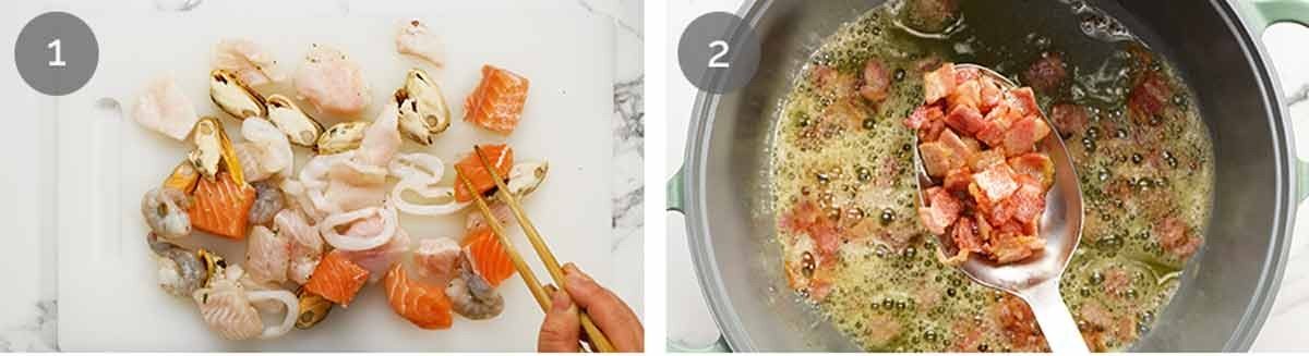 Prepare marinara mix – Separate the raw and cooked seafood (usually mussels, sometimes prawns/shrimp). They will go into the soup at different times. Then cut large fish pieces into ~2.5cm/1″ pieces.
