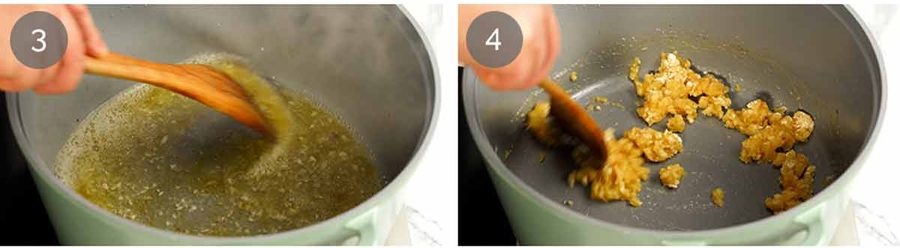 Deglaze – Give the garlic a quick sauté in the butter, then simmer the wine rapidly on high heat until mostly evaporated which will cook out the alcohol and just leave behind the tasty flavour that will add depth to your broth. As it simmers, scrape the base of the pot to loosen any bacon golden bits so it dissolves into the wine (it’s called fond and it’s free flavour!).