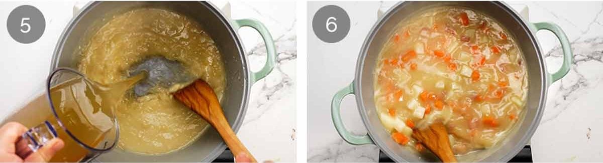 Roux – Next, cook the flour for 1 minute. It will be a pastry sludge. This is called a roux, and this flour mixture is what thickens the soup broth.