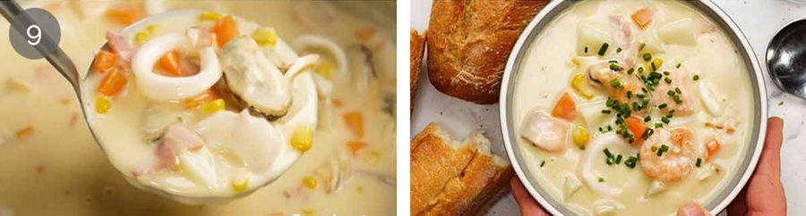 - Cook bacon in butter, remove. Sauté garlic, deglaze with white wine, make roux. Add stock, simmer potato, carrots and bacon 10 min. Add cream, corn, fish sauce, pepper, raw seafood – simmer 3 min. Stir in cooked seafood, taste for salt. Serve!
