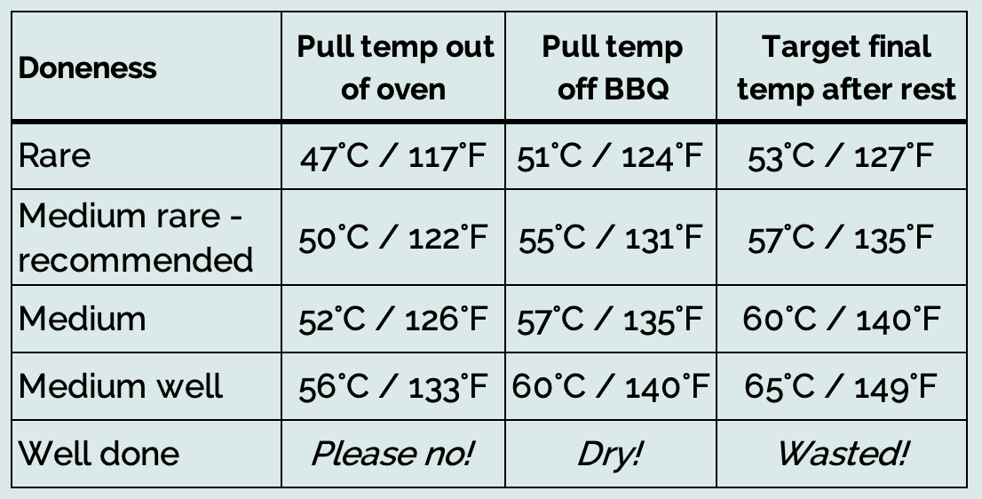Thanks Nagi for this wonderful recipe! I tried it for the first time today, it did take 1 hr @120C fan forced to get to 49C in the centre, and then another 13 min of seating. Final temp was 56.5C after 5 min resting and it was bang on medium rare, sooo tender and even but no blood. Loved it!!
