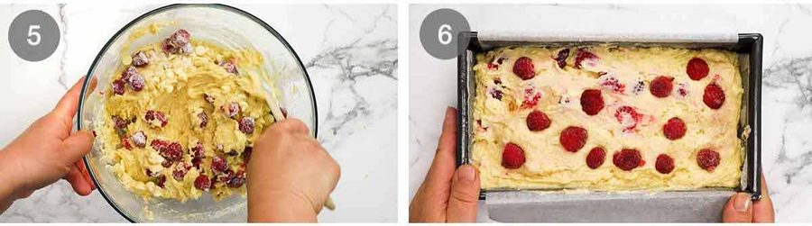 ⚠️ If using frozen raspberries, you want to work fast and minimise stirring because frozen raspberries chills and therefore thickens the batter if you leave it sitting around. This will affect how well the loaf rises in the oven, because it’s starting with a colder batter so it takes longer to start baking and rising properly.