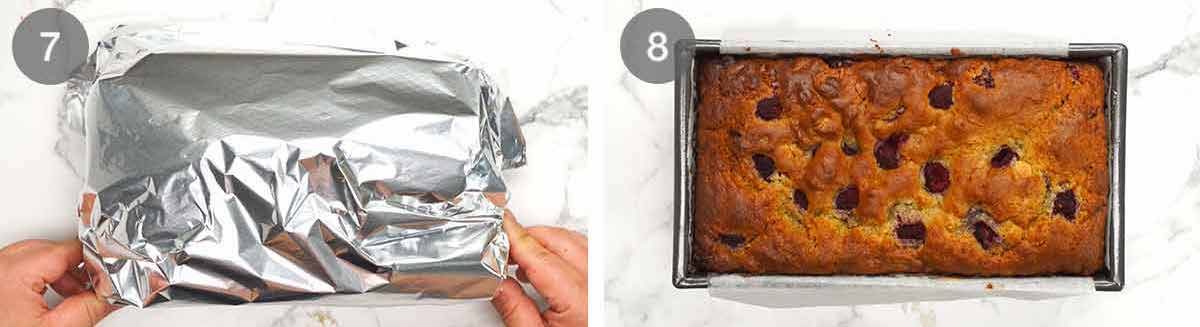 Bake 75 to 80 minutes – Bake for 40 minutes in a 190°C/375°F (170°C fan-forced) oven. Loosely cover with foil (to stop it from getting too brown). Then bake for a further 35 minutes if using fresh raspberries, or 40 minutes if using frozen. The loaf is ready when a skewer inserted into the centre comes out clean without a raw batter smear.