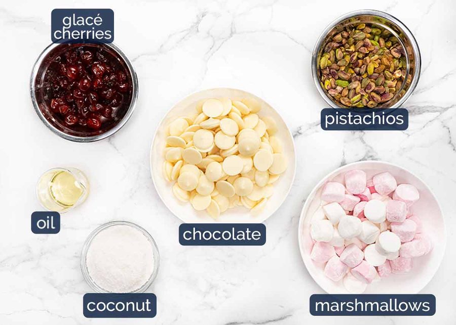 Another home run! I used “dandies” mini marshmallows here in the US, coconut oil (the taste-less kind), dried bing cherries, unsweetened shredded coconut, lightly salted pistachios, and for the 2nd batch I added maybe 1/8 to 1/4 tsp of freshly grated nutmeg to the melted chocolate. Very tasty!