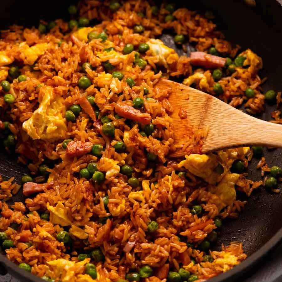 Recipe video above. This is the fried rice version of traditional Vietnamese red rice (plain tomato rice steamed in a pot). I added ham, peas and egg to turn it into a quick and easy meal. Frying up the tomato rice with garlic adds extra flavour which is on point!Serves 2 as a meal, or 4 to 5 as a side.